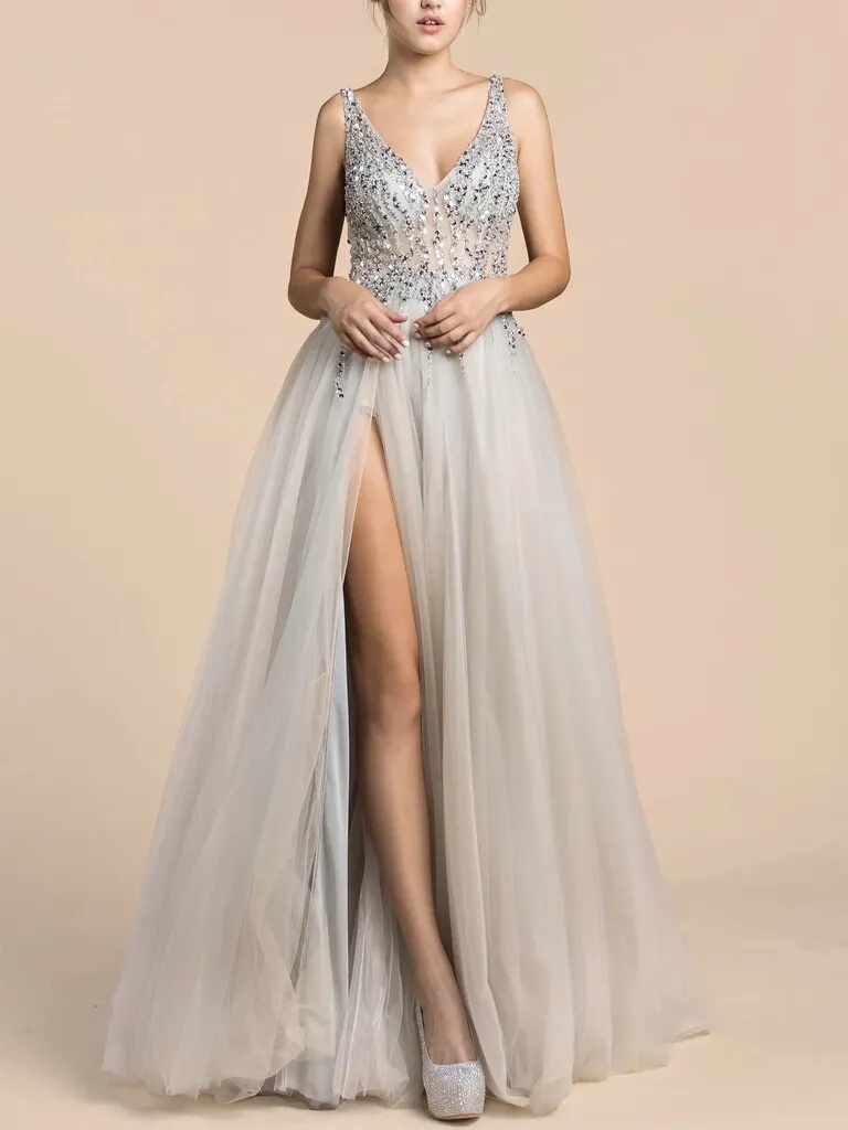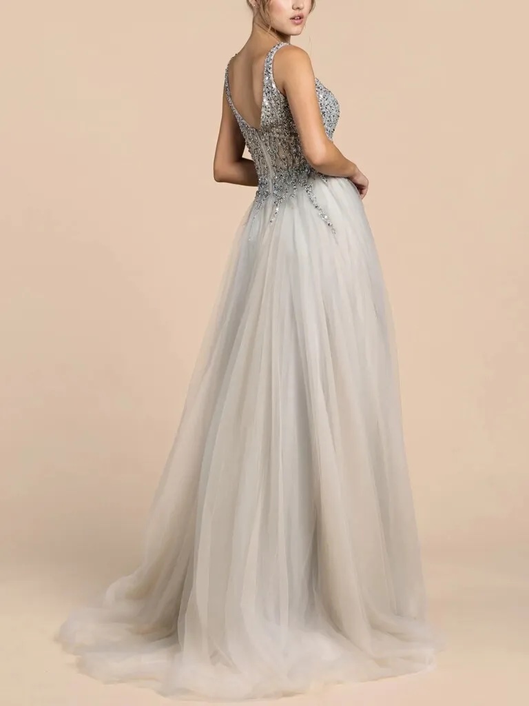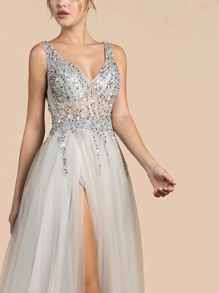 La parte superior está completamente bordada con lentejuelas, canutillos y pedrería plata, sobre una base de tul con una leve transparencia. El bordado también cae sobre la parte superior de la falda.
